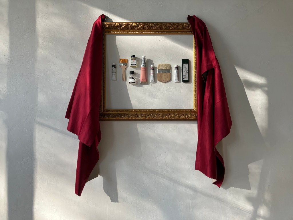 Wooden Frame, Cloth, Paint tubes, Brushes, Pencil Tin, Turpentine, Linseed Oil